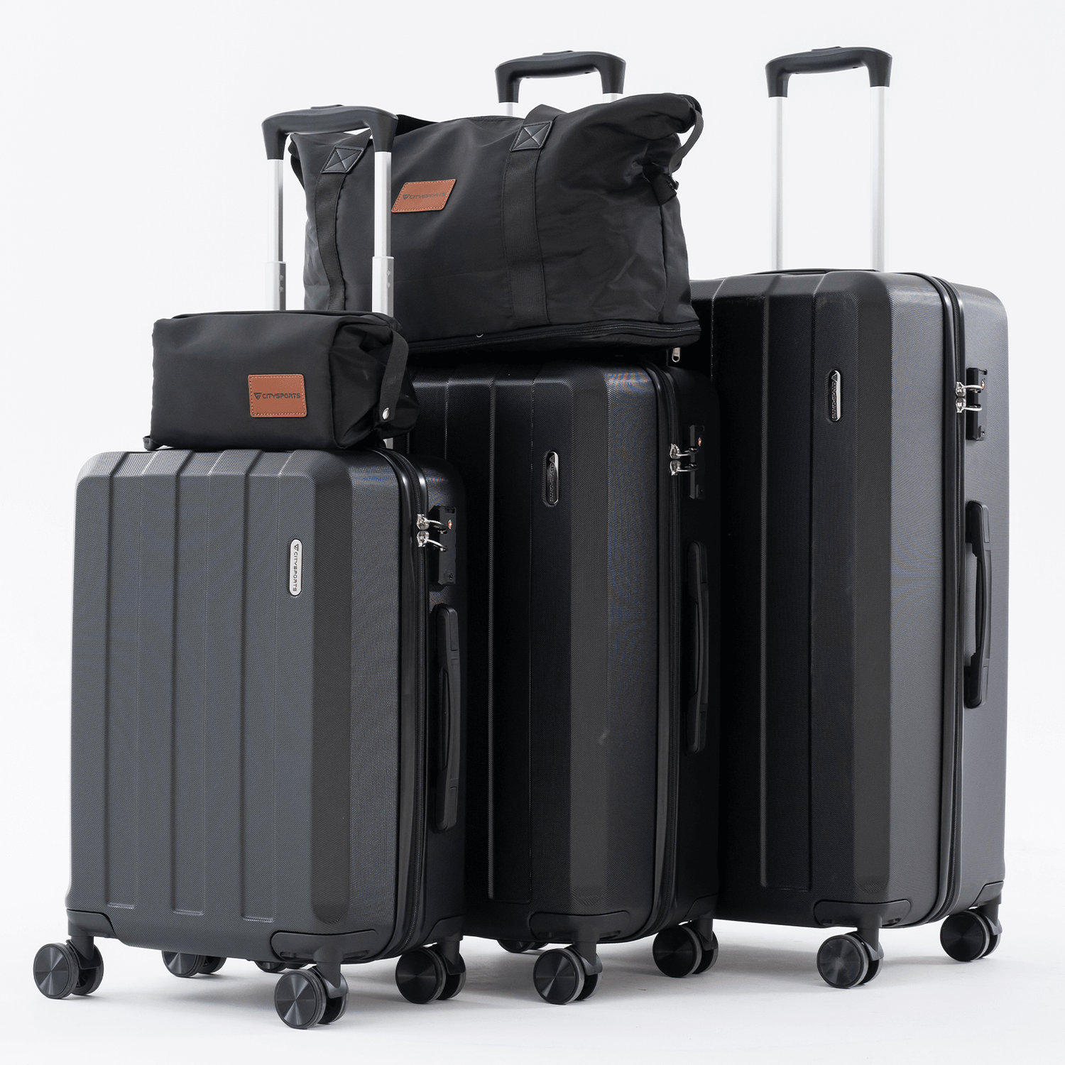 Travel with a complete, matching luggage set that is stylish, durable and lightweight. The CITYSPORTS 5-piece luggage set includes three hard-shell trolley suitcases, a duffle bag and a toiletry bag – everything you need from weekend getaways to long international trips.